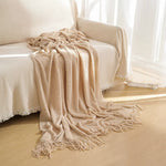 Upgrade your home decor with this Premium Woven Knitted Throw Blanket featuring delicate tassels. This soft, breathable blanket adds warmth and style to any space. Perfect for the living room, bedroom, or even as a cozy office nap blanket, it's designed for all-season comfort.